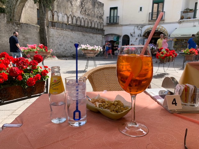 We stayed last night at Hotel Parsifal and we were upgraded to a room with a great terrace overlooking the coast. Magnificent. The hotel dates back to 1288 when it was built as a Convent. The gardens are beautiful. We threw our bags in the room, and headed to the Piazza Duomo for our first Aperol Spritz and G n T. They were worth waiting for!