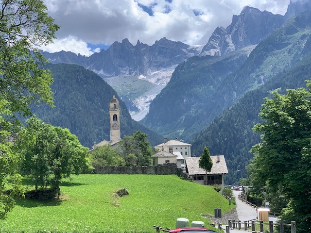 It was the Splugen Pass , 2113 m , ad 50 hair pin bends on the way down into Italy! However most of the time there was a line down the middle which is a MUST for Rhonda but there was a few roadworks, but the scenery made it well worth the drive! We arrived safely in Bellano and we have a great view of the Lake , but more about that next time!
