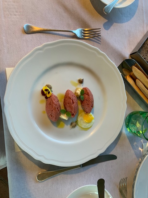 We had a great dinner at Osteria dei Catari in the village. The raviolini del plin with butter and sage sauce was delicious and Greg’s rather strange “Roasted beetroot tartare with peas and fake egg yolk” was, according to Greg wonderful!