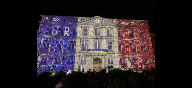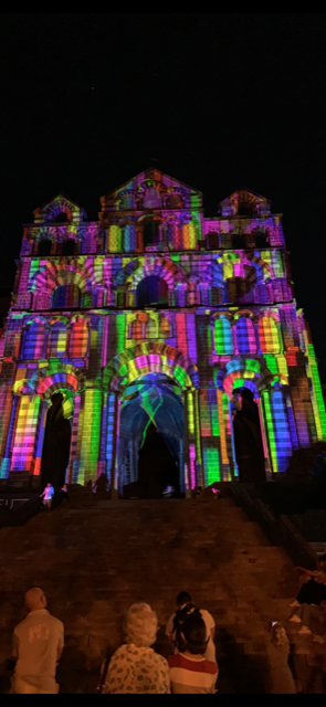 We went home for a bit of rest before venturing back out for dinner and a spectacular Lumiere Show! Dinner was a Faux Fillet de bouef , Rhonda’s with a blue cheese sauce and Greg’s with a mushroom sauce, accompanied by some veges and house frites. We shared a creme brulee for dessert and it wasn’t too bad at all, although Greg’s critique was not enough vanilla bean!!!!