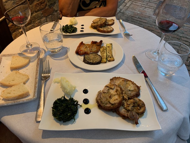 Of course one has to eat so we had a lovely dinner one night in a little out of the way laneway. A speciality of Urbino is Coniglio in porchetta (rabbit porchetta) and it did not disappoint us. However Greg’s panna cotta was definitely not up to scratch, but Rhonda enjoyed her basil strawbs with hazelnuts and meringue.
