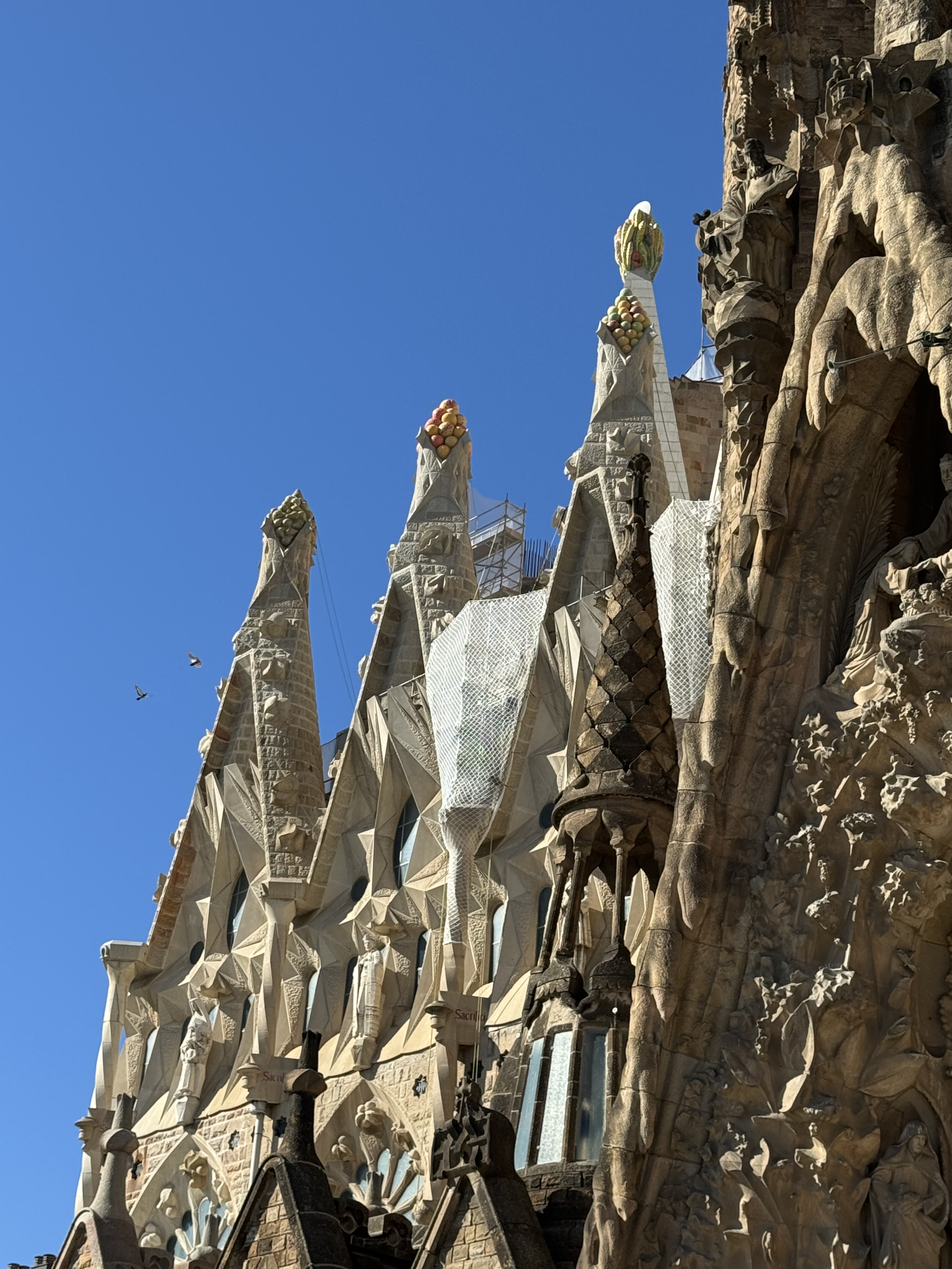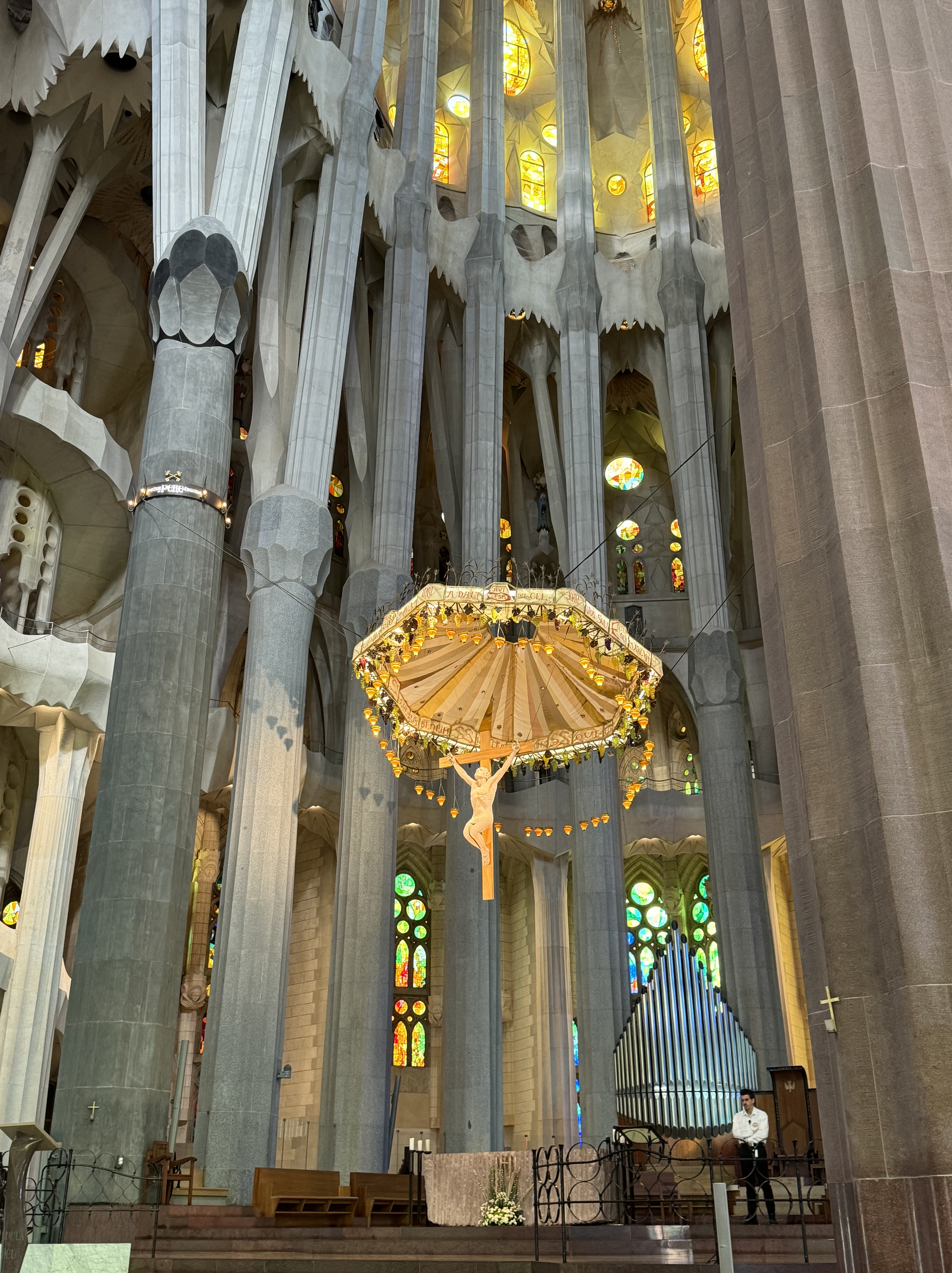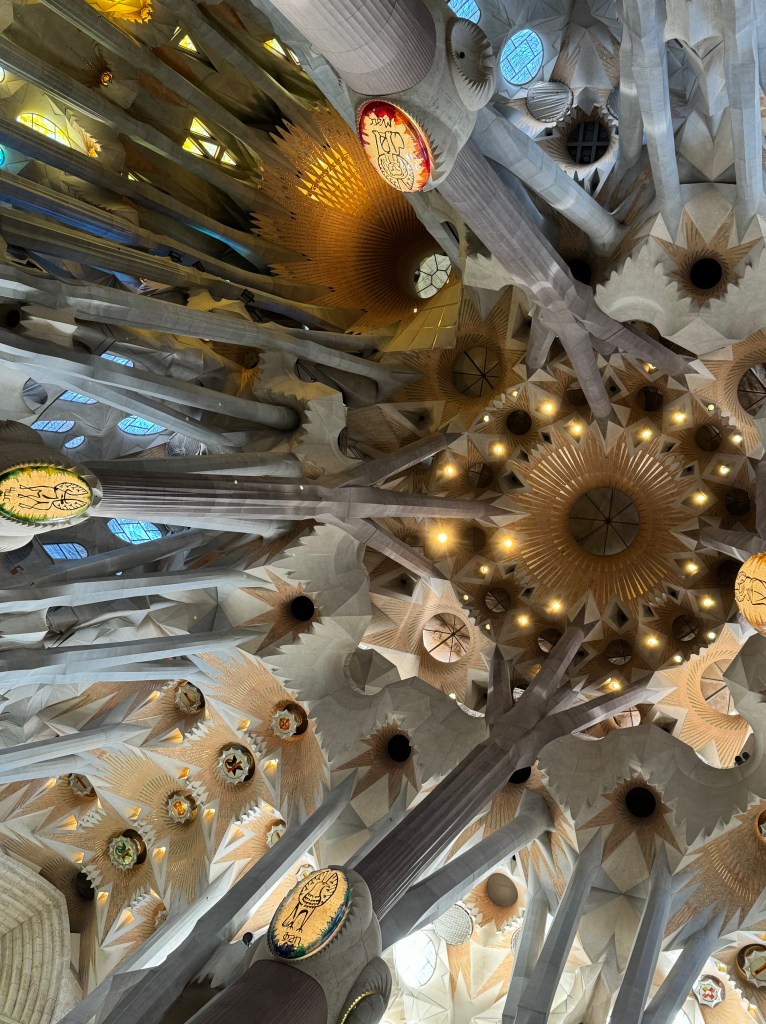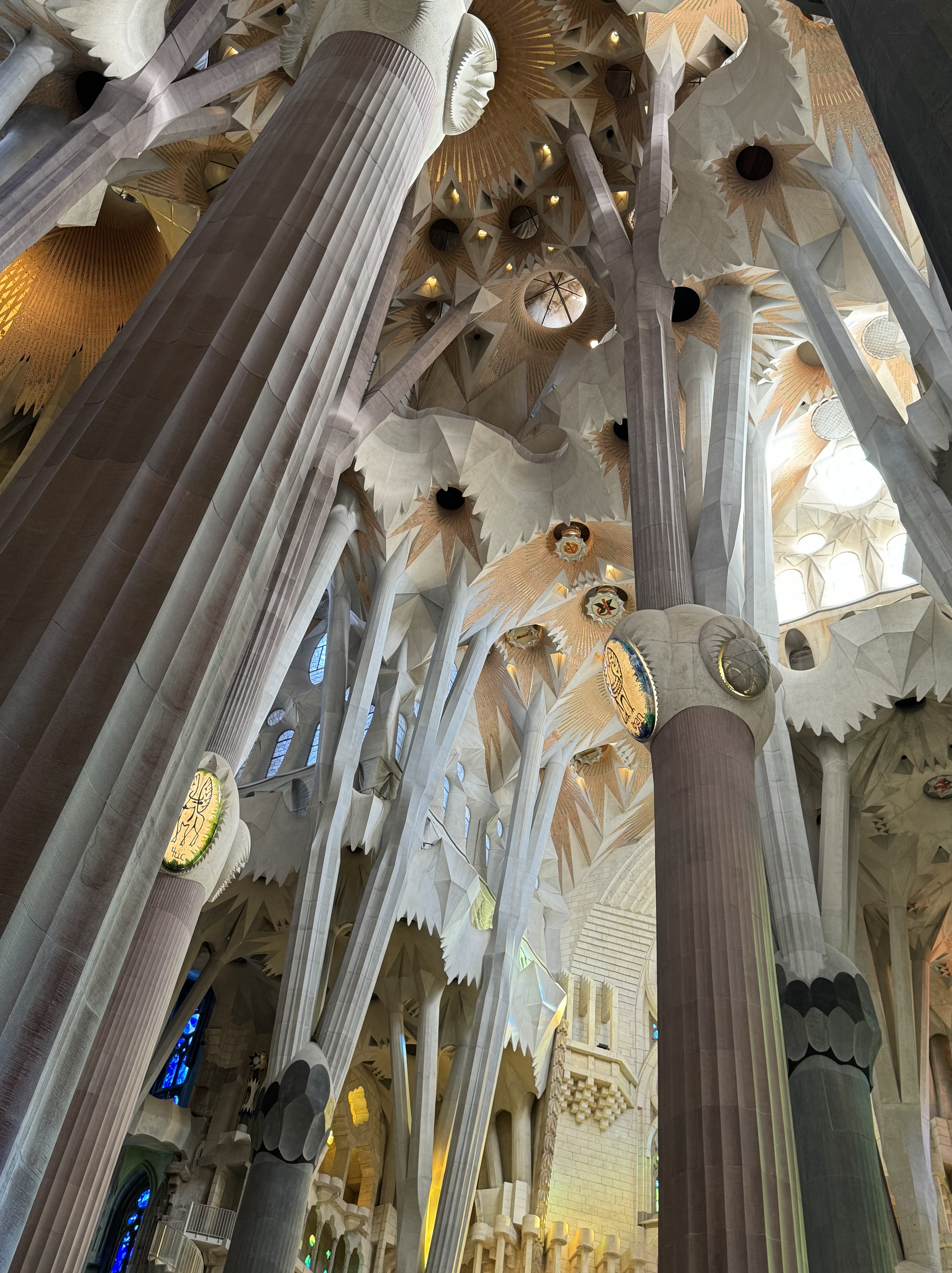 His work was inspired by nature. The interior towers are inspired by trees and throughout the building you see turtles, sea shells, and fruits. the spires outside are laden with grapes, apples, wheat and oranges.It was hoped that it would be completed by 2026, the 100 year anniversary of his death, however our guide told us it would probably be another 10 years. We think may be longer as the last spire to be completed has a bloody long way to go!
