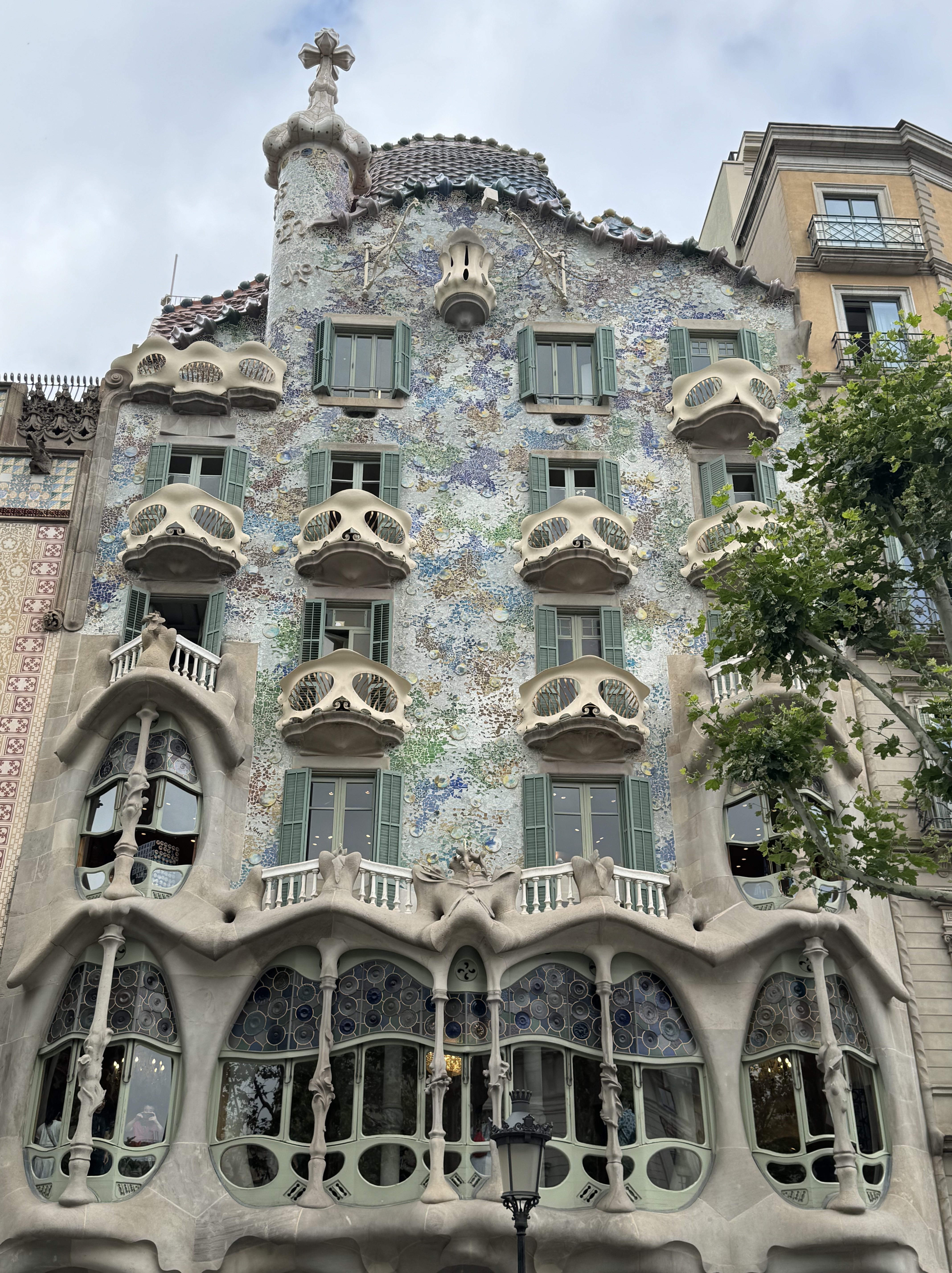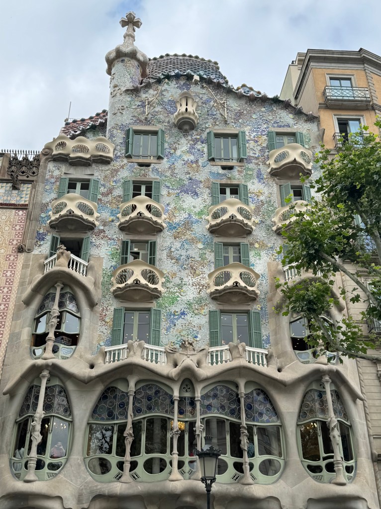 We then wandered up the Ramblas to our first Gaudi building, The Casa Batllo, and we just viewed it from the outside. It is considered one of his masterpieces which he renovated between 1904 and 1906, It is known as “the house of bones”. Can you see the skulls and bones?