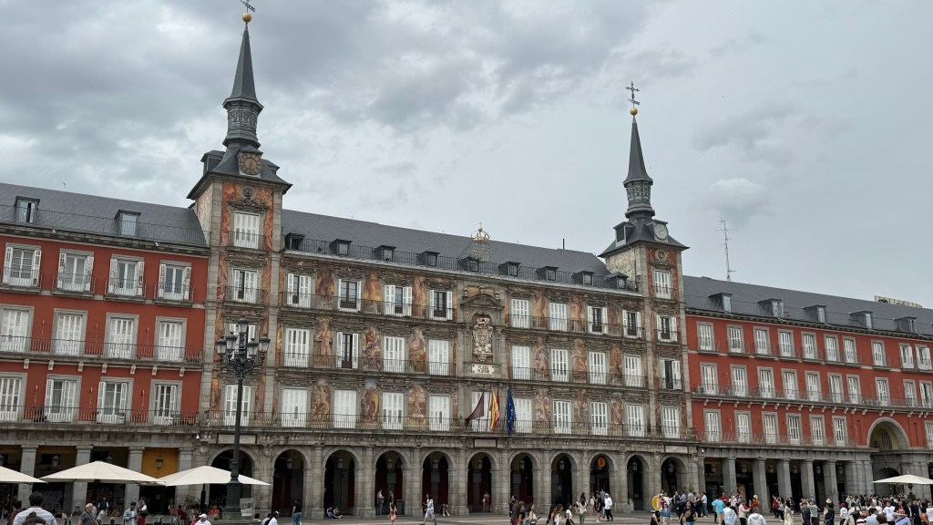 The first night in Madrid we were ready for a drink, so we headed first into Plaza Mayor, which originally was the first marketplace and bull fighting ring in Madrid. Today it is surrounded by bars and restaurants, particularly good for drinking jugs of sangria! The facade of the Casa de la Panaderia (The Bakers Guild) is covered in beautiful frescoes. It was where in the 1500 and 1600’s the main bakery of Madrid stood and controlled the price of bread and on the opposite side of the Plaza was the Butchers Guild where meat was stored and sold.