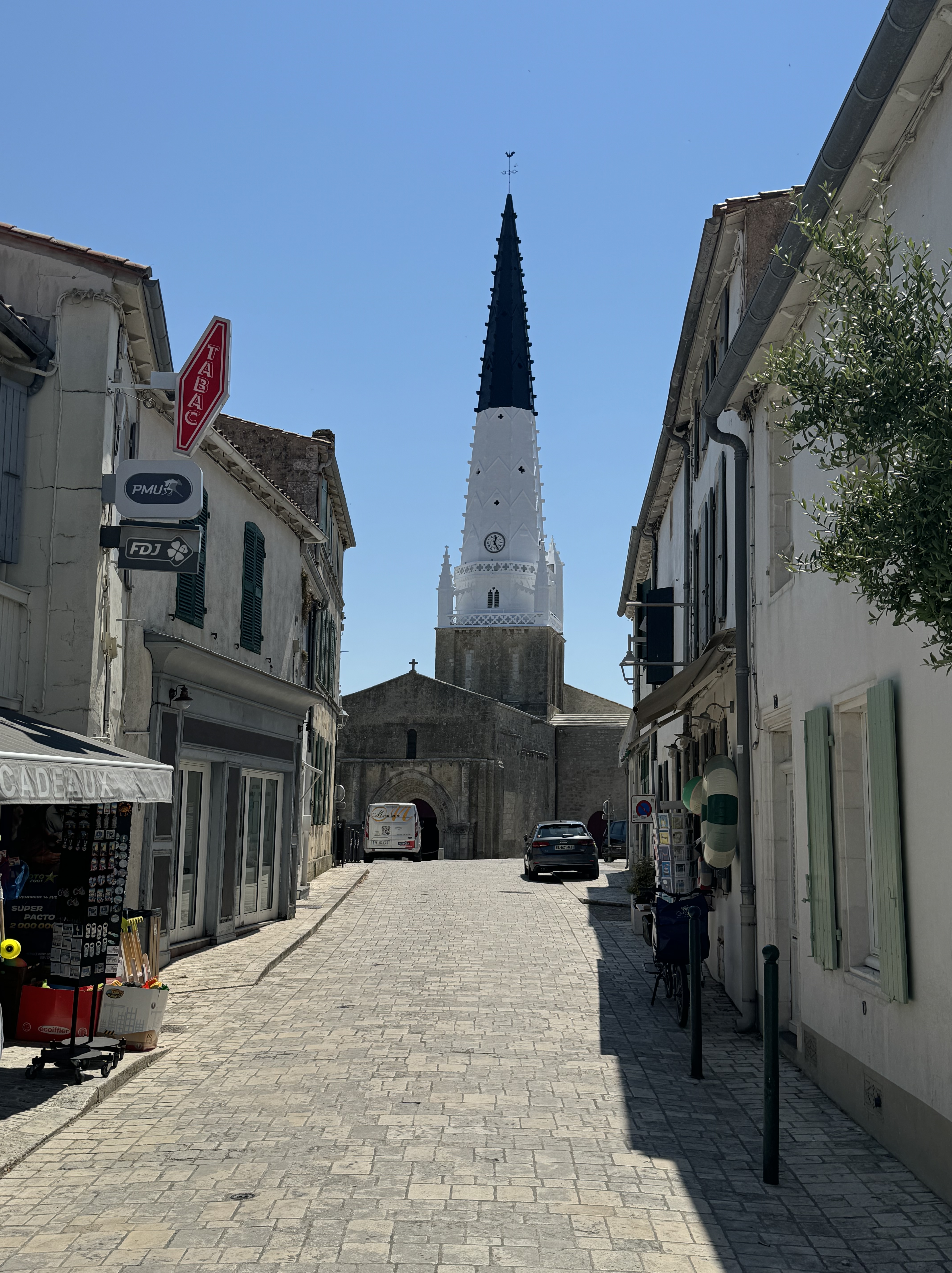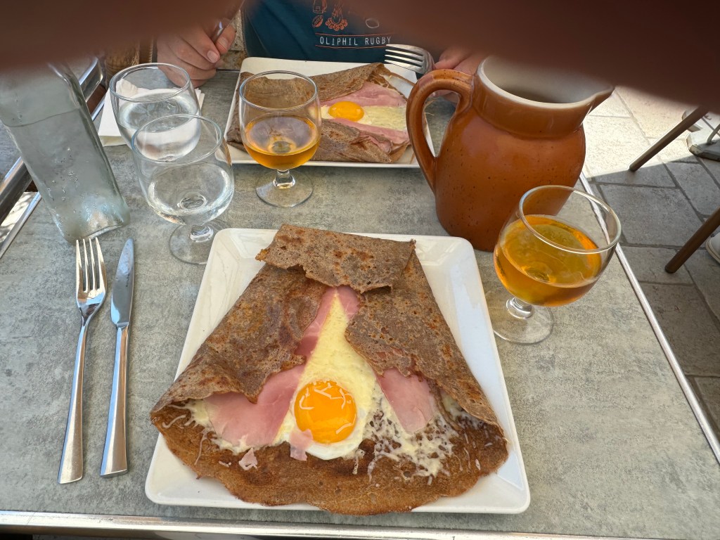 Next stop was ARS-en-Re. The church and its rather weird spire is the focal point of the village. We decided at Ars that it was time for lunch so we opted for a crepe complet with a pichet of cidre,(a crepe with ham, cheese and egg and a jug of apple cider). Yummo!