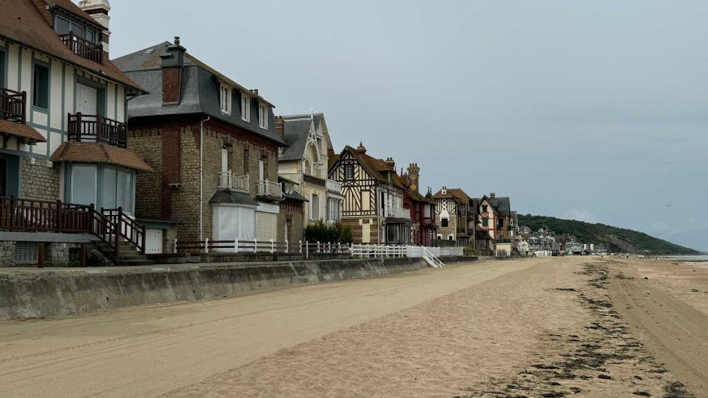 We took a drive to check out the beaches on another part of the Normandy Coast in the Calvados region. First stop was Villers-sur-Mer. We found it quite up market with the extravagant villas sitting right on the beach. It is said that the coast is visible for 2.1kms, well maybe on a nice sunny day!
