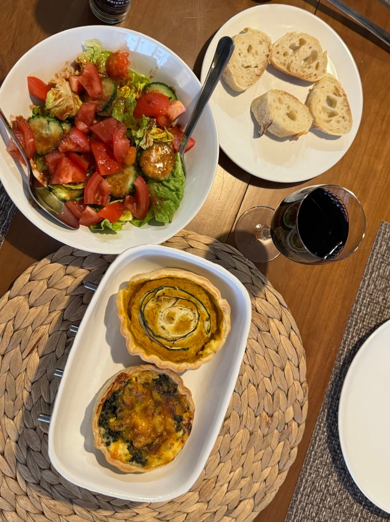 In France there are a lot of shops where you are able to buy rather good “ready made “meals. One night we bought some great little quiches and some petite Normandy apple tarts! An easy dinner but delicious! Of course, it was followed by cheese and a glass of red!