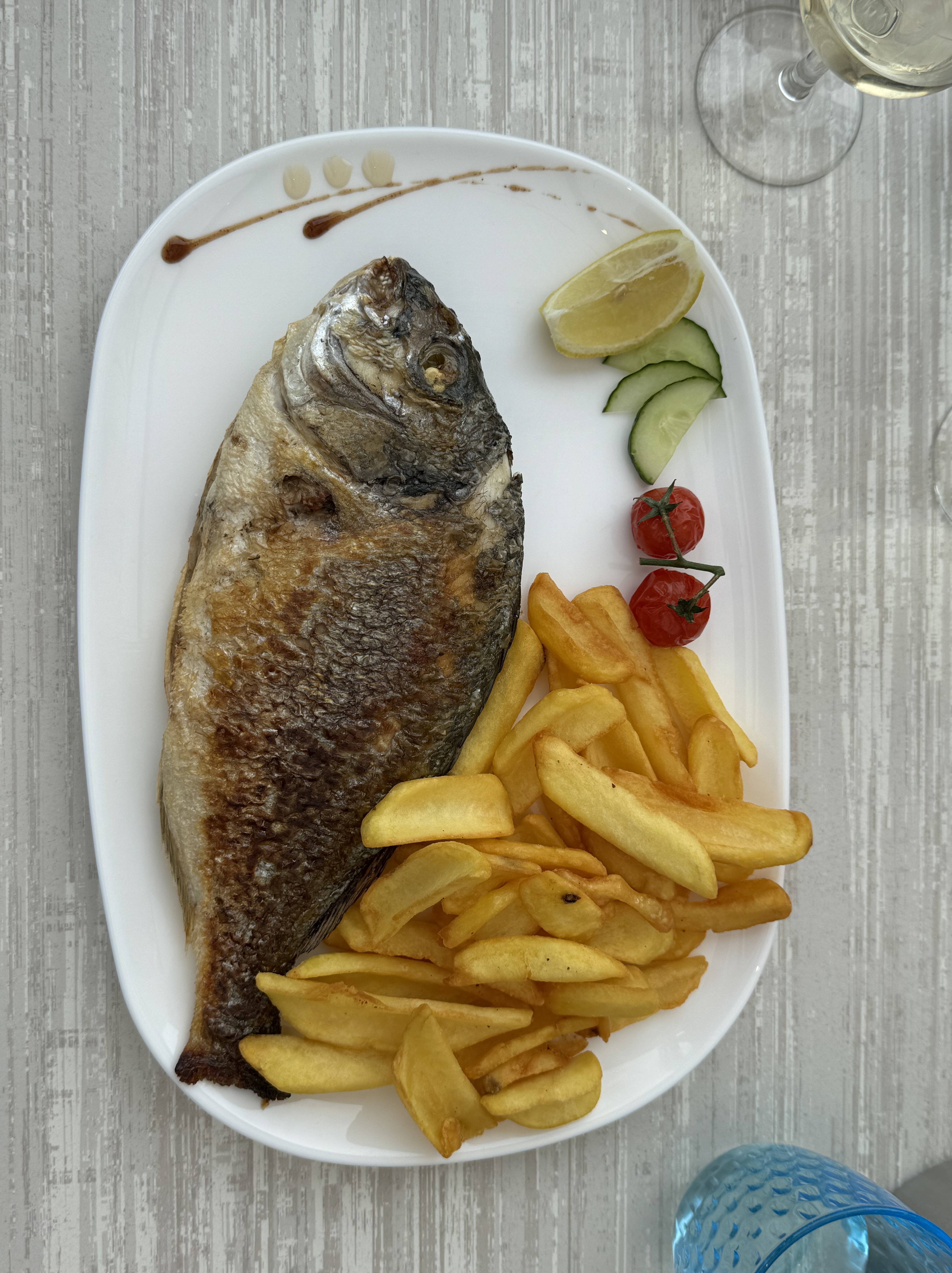 As you can see the weather was not kind, grey skies, drizzly rain and a chilly wind, however the thing that saved the day was lunch. We finally found our whole grilled dorade (sea Bream) and it was bloody delicious, worth the wait!