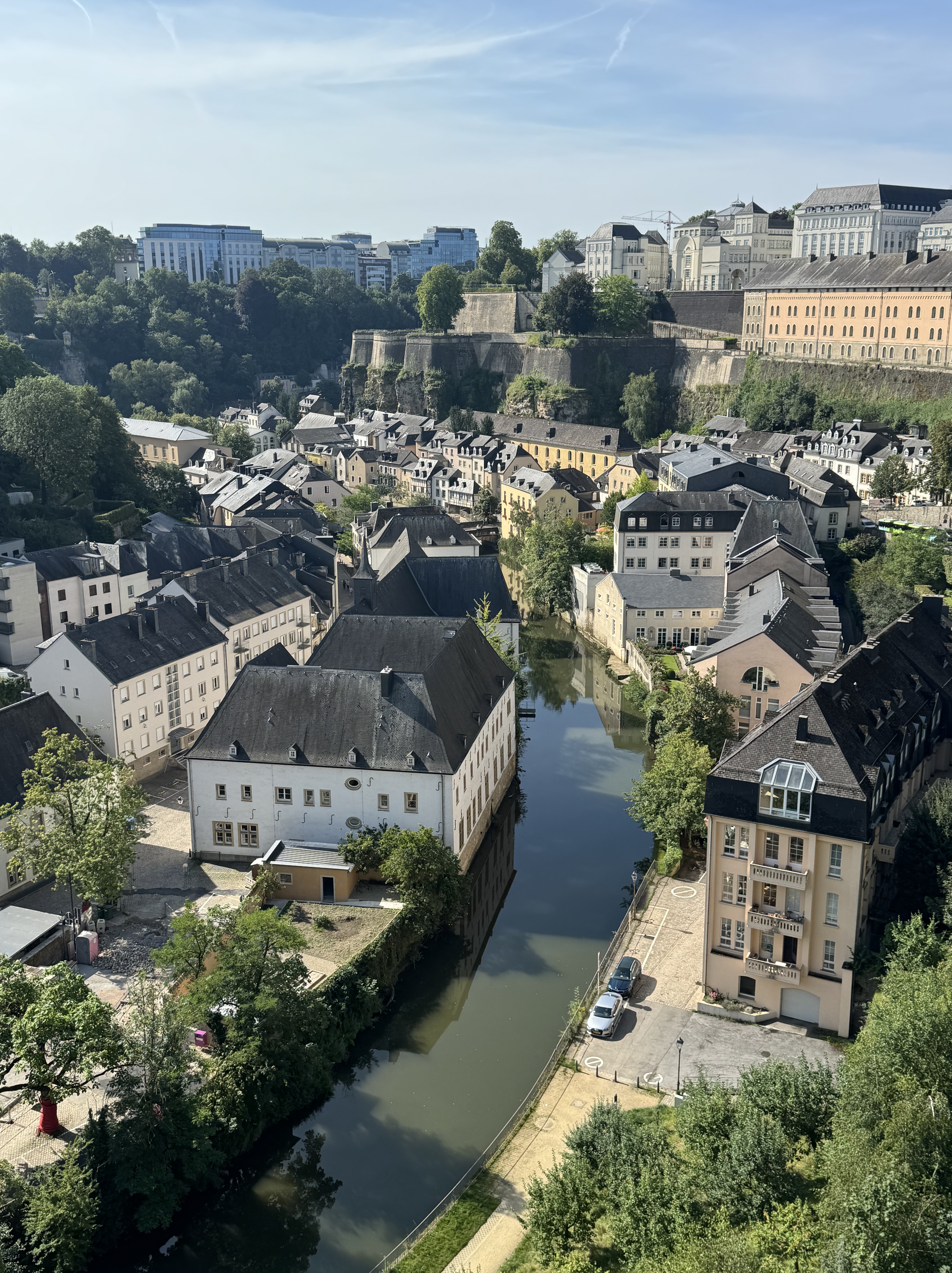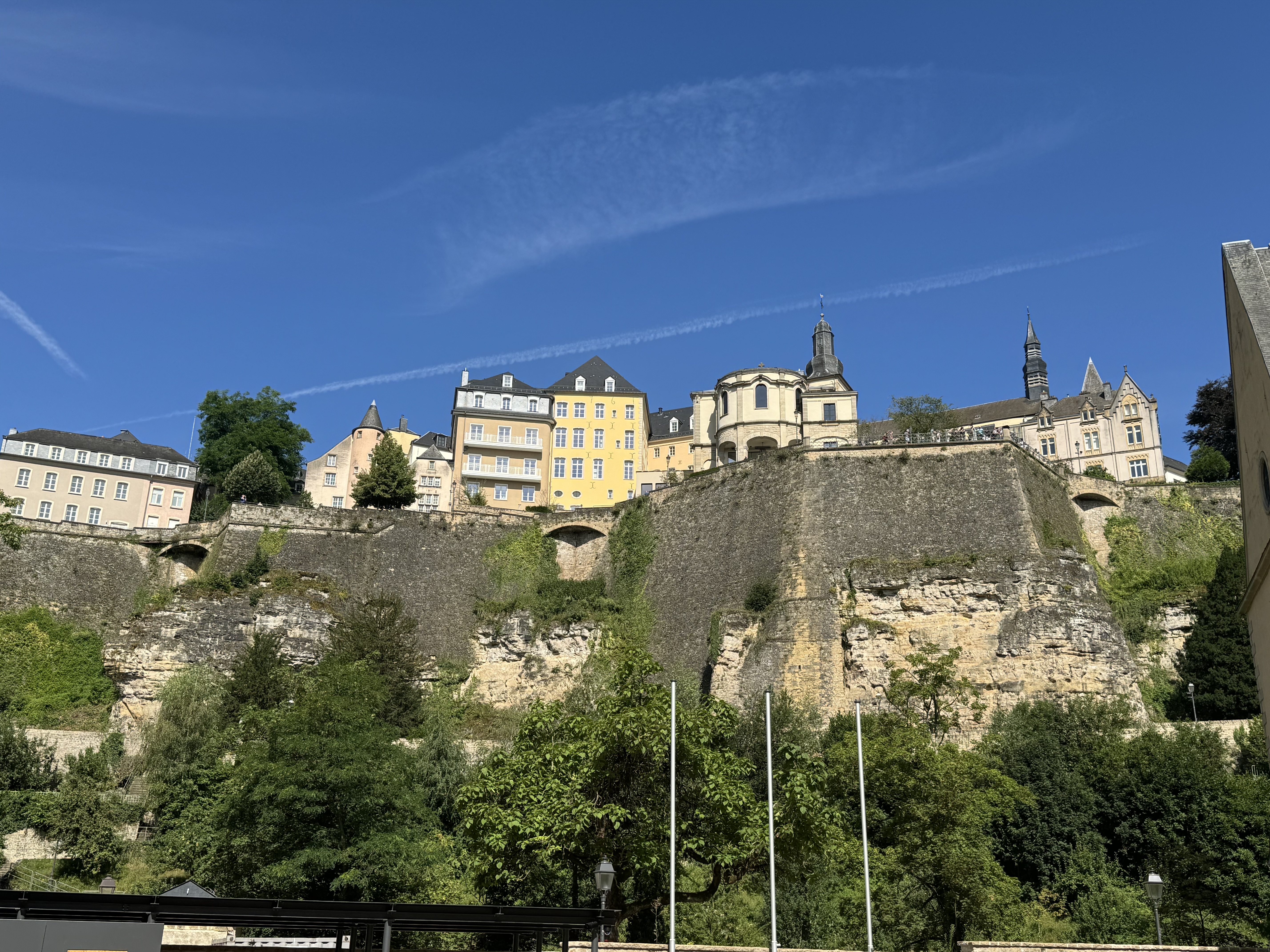 The definition of a corniche is a road or walkway built on the side of a mountain with terrain steeply rising on one side and falling away on the other. That is exactly what it was, absolutely stunning. It overlooks the Alzette River and the lower part of the town known as the Grund.