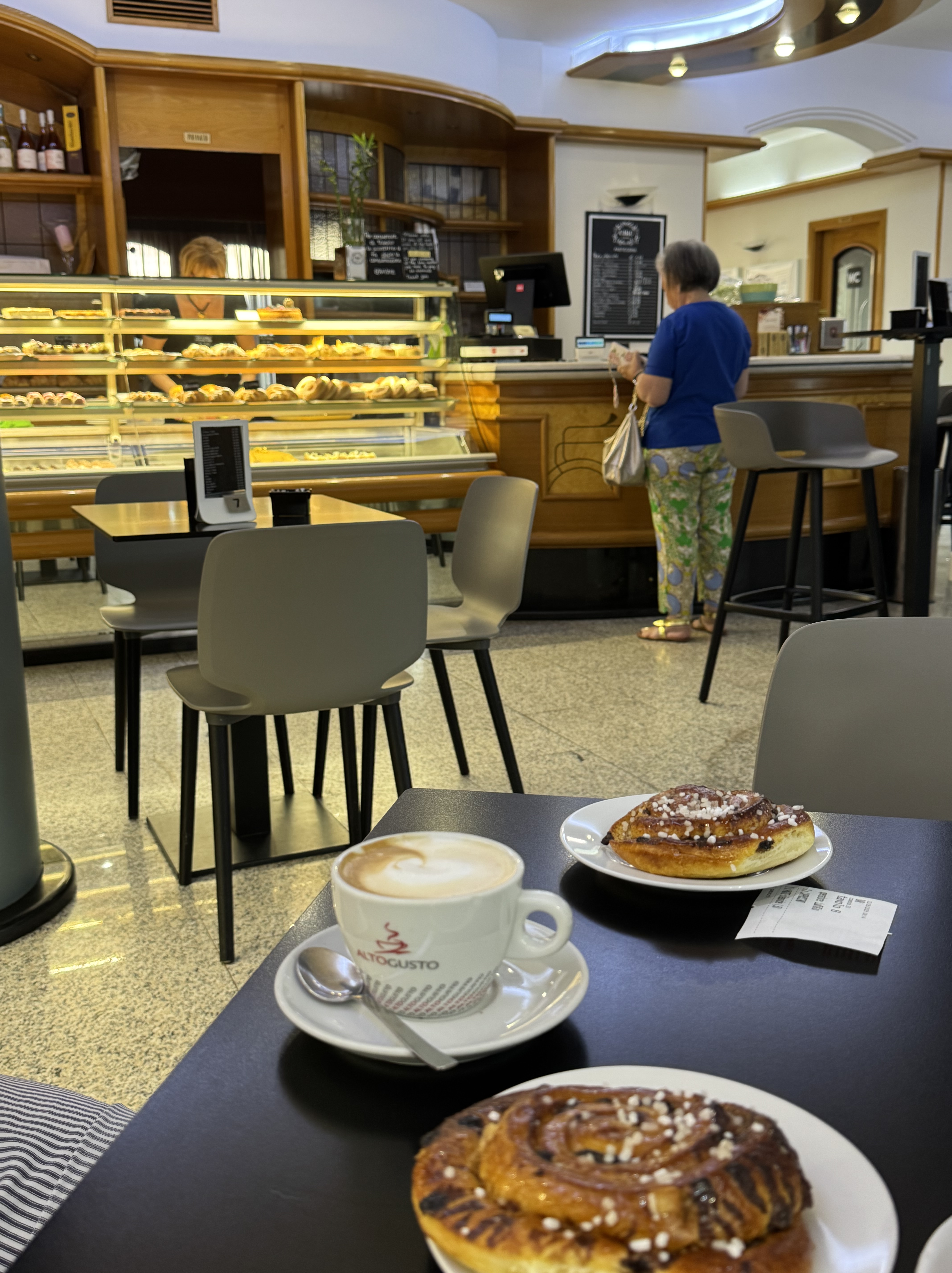 We have found our Brunettis here in Alghero for our Sunday breakie. There are loads of pastries and incredible looking cakes and small treats. We happened to ask the waiter what one in particular was and he immediately gave us one for free to try. That would not happen back home.