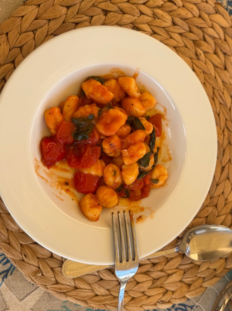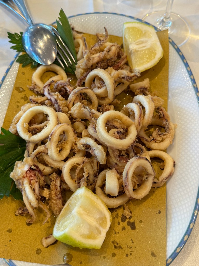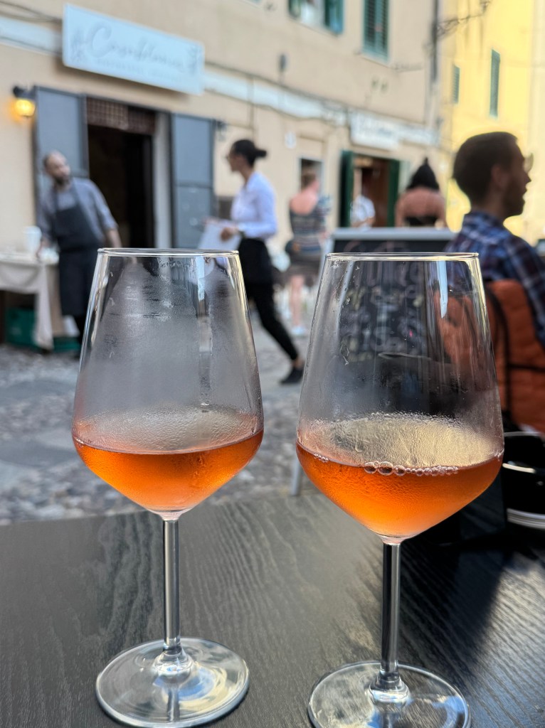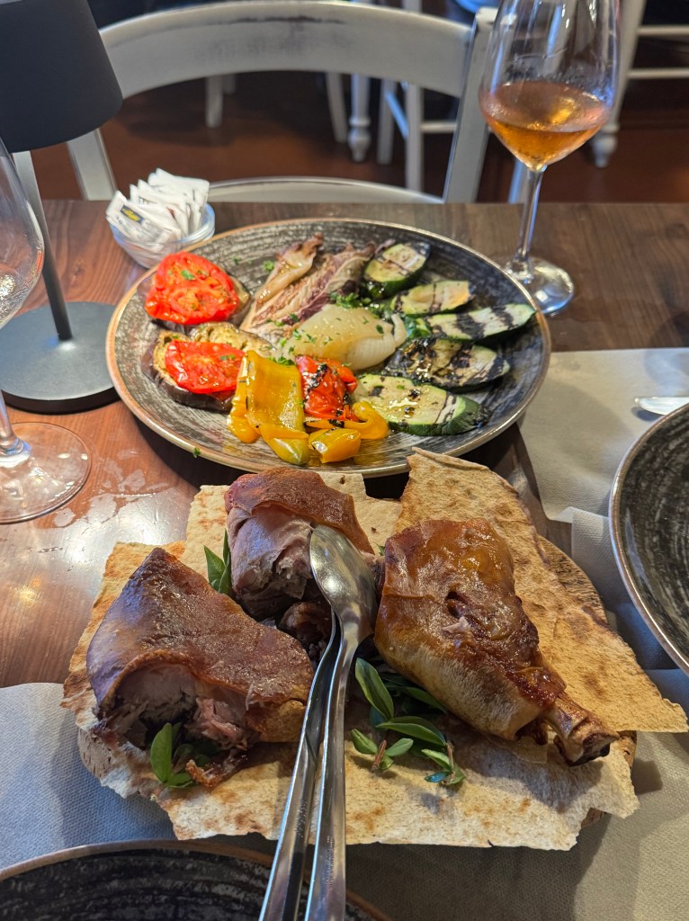 Luckily the suckling pig was on the menu as was a dish of Sardinian pasta called fregola made with semolina and water and then toasted and served with tomatoes and zucchinis. We also had a plate of delicious grilled veges washed down with a glass of rose. At the end of the evening when we asked for the bill, to our pleasant surprise we were told that “GG” , the guy that stuffed up our other reservation had kindly paid our bill. It was a freebie, should have had a whole bottle of rose!😂The meal was delicious.