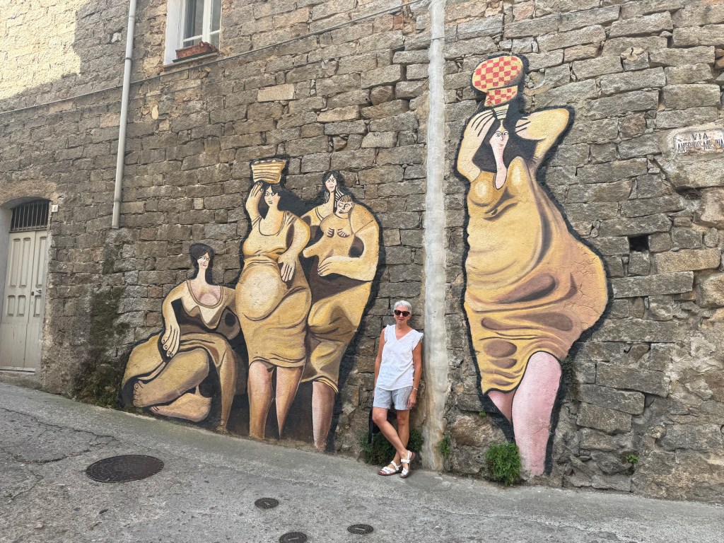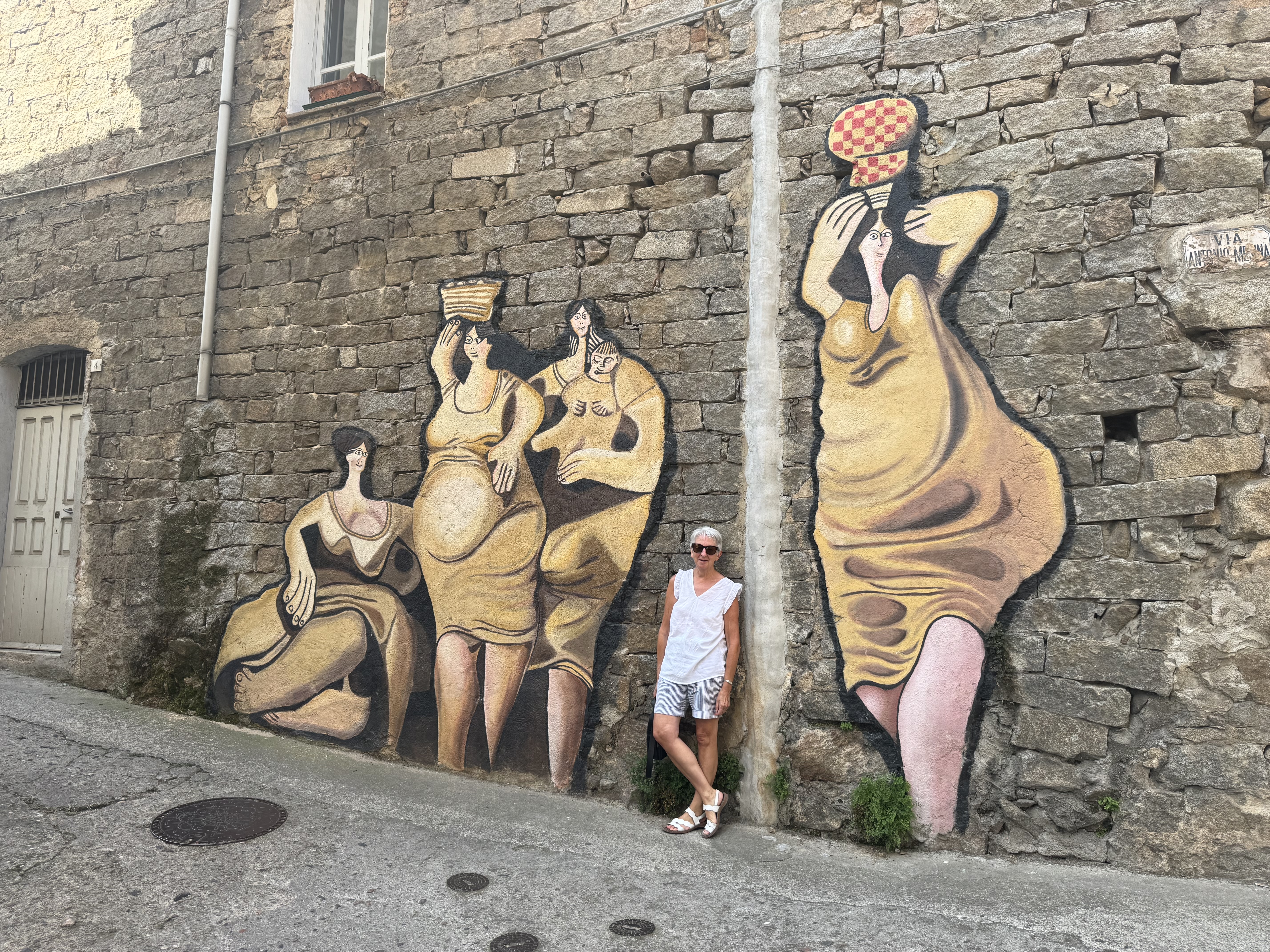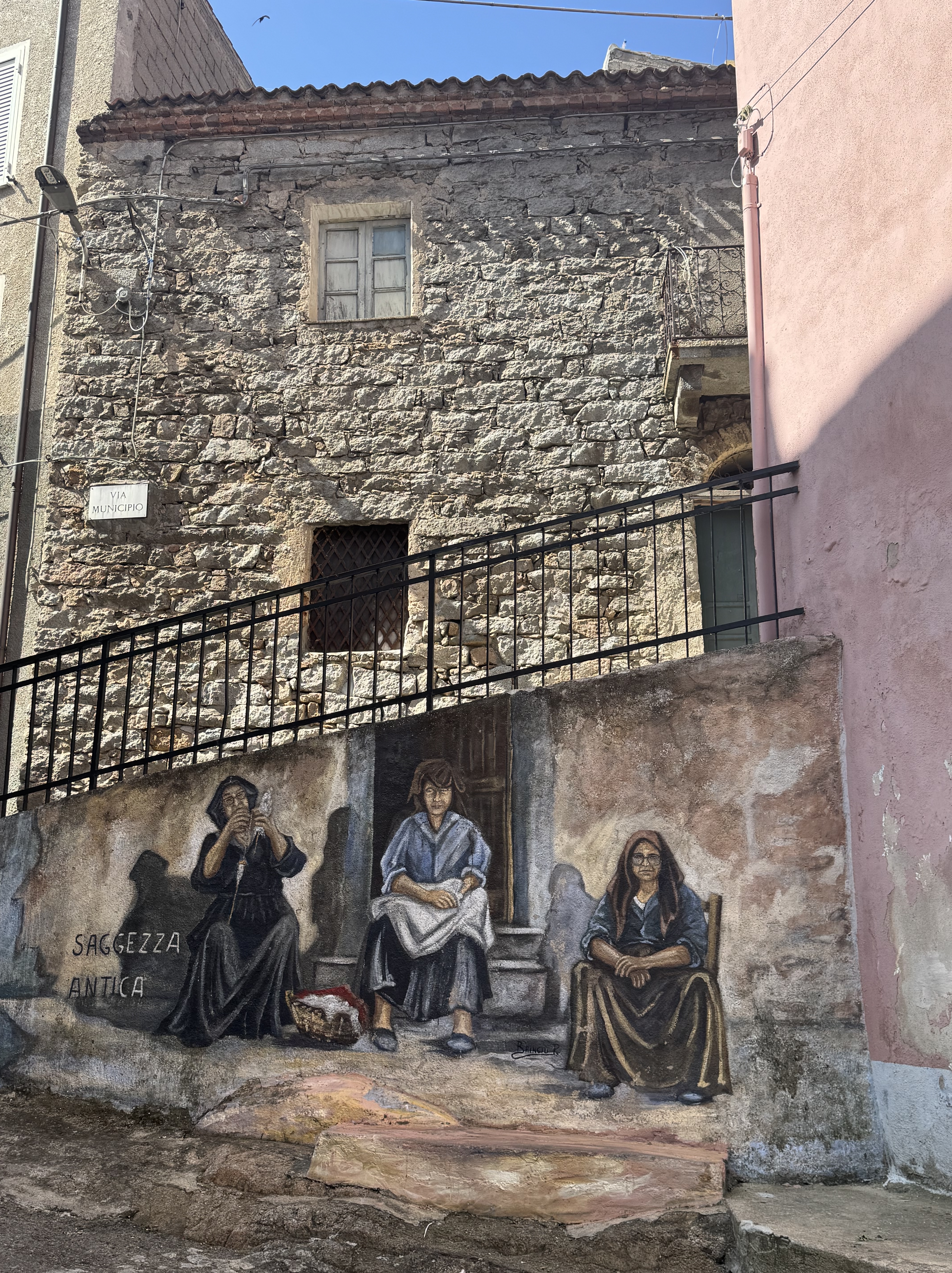 We took Harley for another spin to the village of Orgosolo, a 2 1/2 hour drive into the middle of Sardinia. The village is reknown for its painted murals on many of its buildings. The first murals were painted in 1969 and were politically inspired by an anarchist group. No other murals were added until 1975 when a high school teacher organized for students to paint many more and it continues to this day.