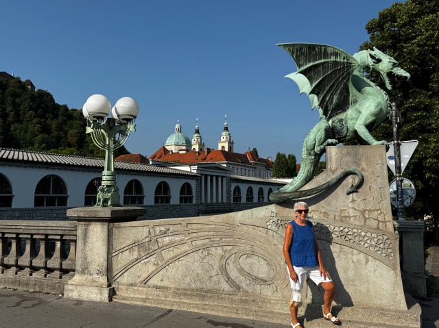 The following day was again spent wandering the Old Town. The dragon is the emblem of Ljubljana and is considered a symbolic protector of the city. It represents strength, courage, and might and is depicted on the city’s Coat of Arms. One of the main attractions is the Dragon Bridge named for obvious reasons. Legend says that if a virgin crosses the bridge the dragons will wave their tails. Needless to say there was no tail wagging when Rhonda and Judy crossed!!